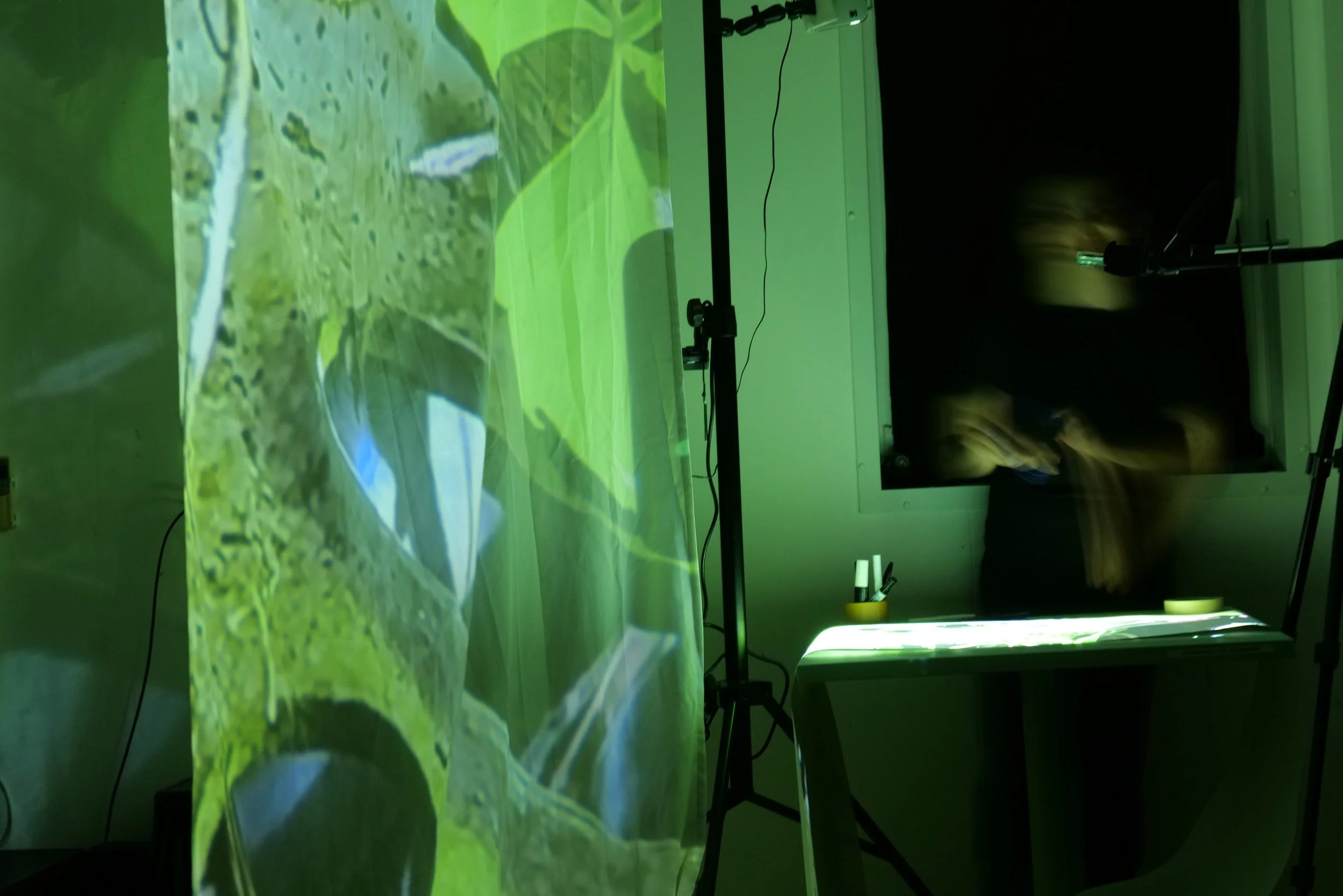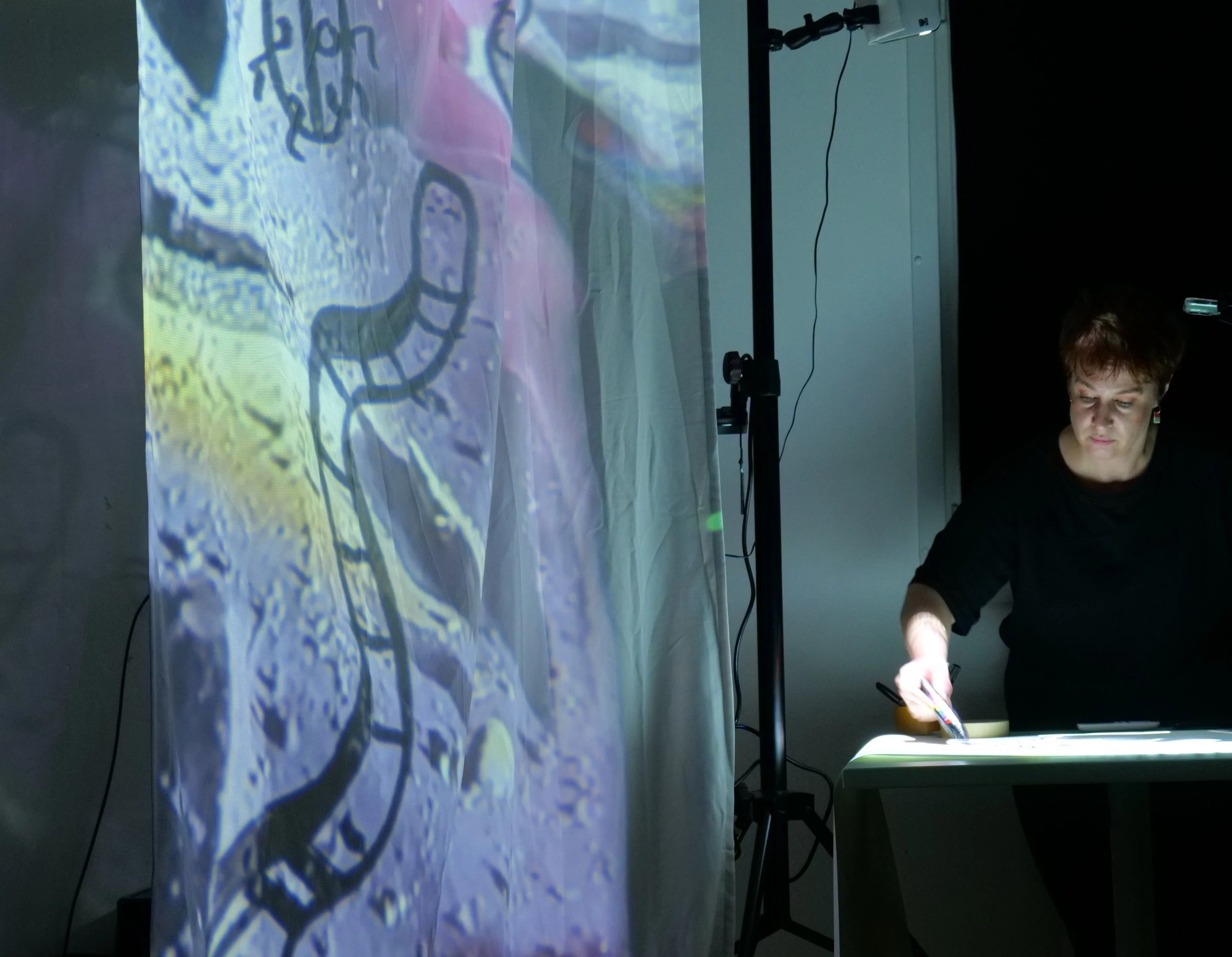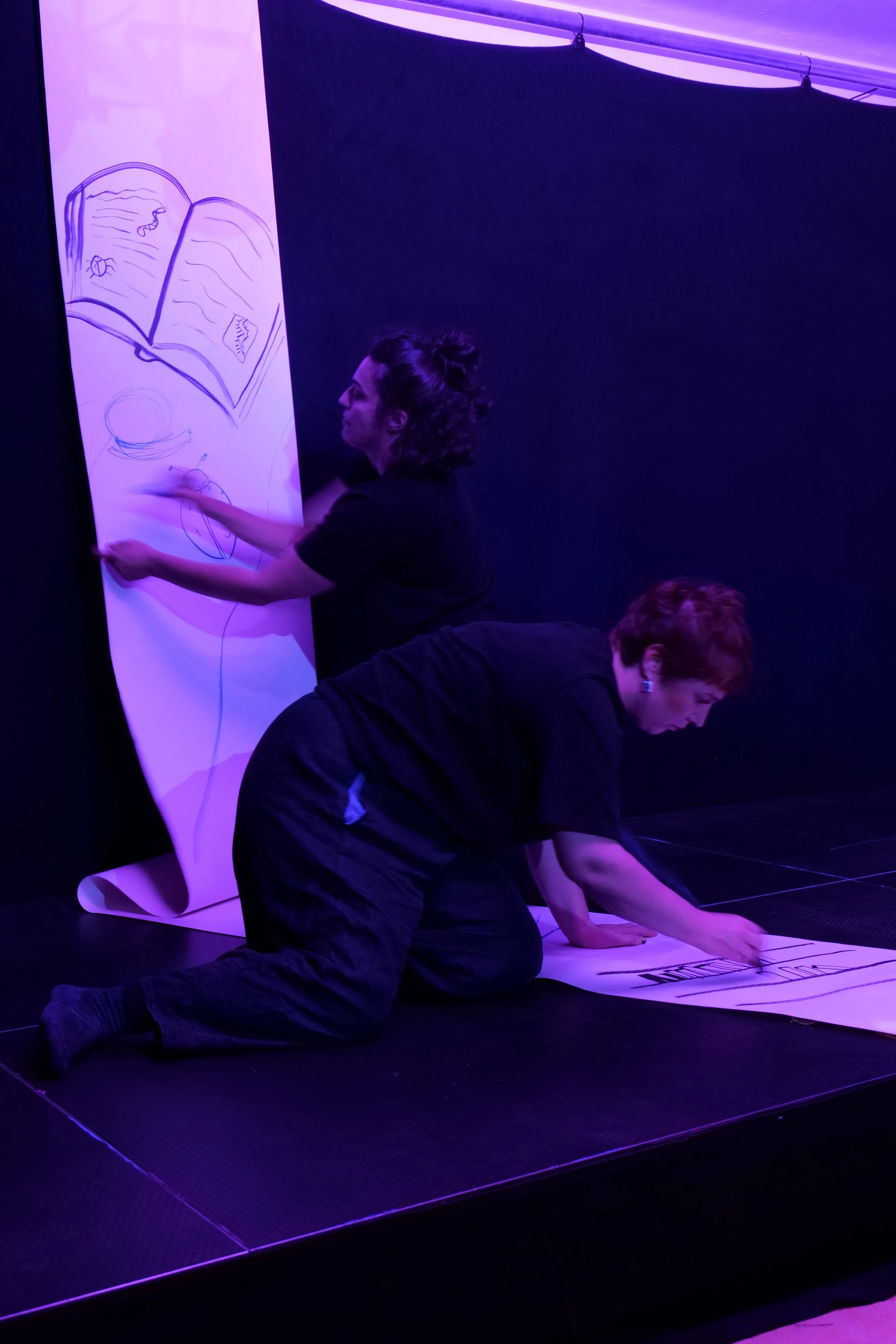 here-elsewhere is a performance where space itself becomes a performer. The artists transform the room through live drawing, projection, and storytelling, creating a layered world that shifts between the seen and the imagined.